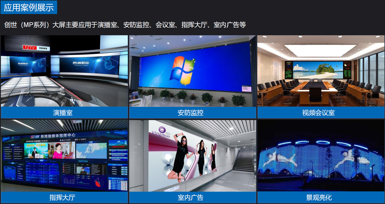 创世(MP)系列主要应用于演播室,安防监控,视频会议室,指挥大厅,室内广告等